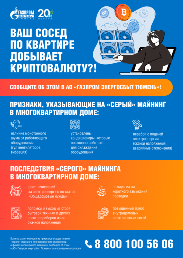 В случае выявления признаков майнинга гражданам рекомендуется незамедлительно обратиться в АО «Газпром энергосбыт Тюмень» по номеру телефона: 8 (800) 100-56-06.
