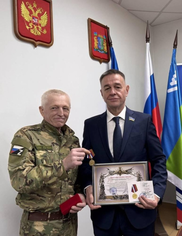 Депутат Думы Ханты-Мансийского автономного округа Андрей Осадчук награжден медалью «Участнику гуманитарной помощи» и получил благодарственное письмо от командования войсковой части 12265. Награды вручены за его активную и систематическую поддержку бойцов из Югры, участвующих в специальной военной операции.